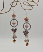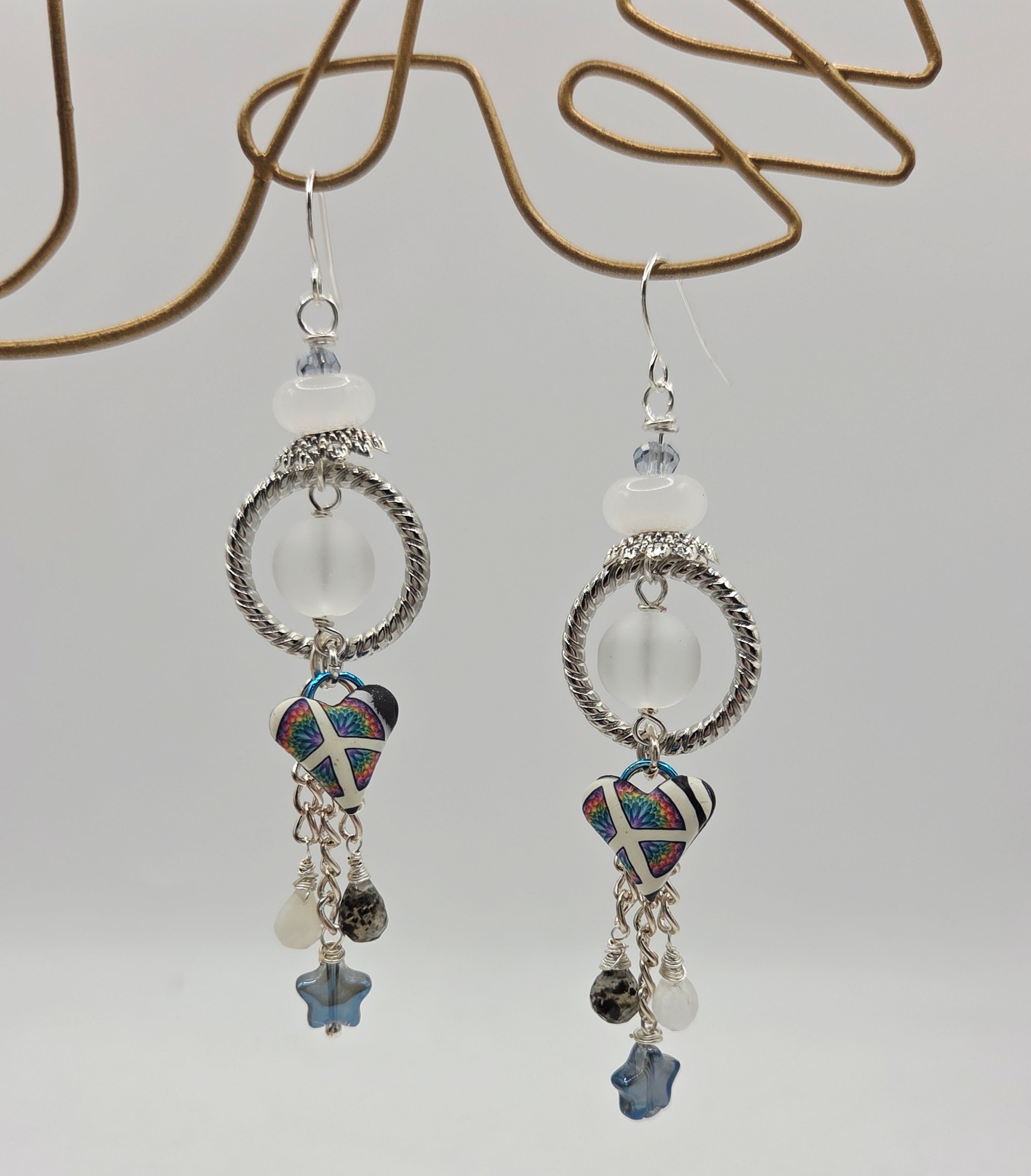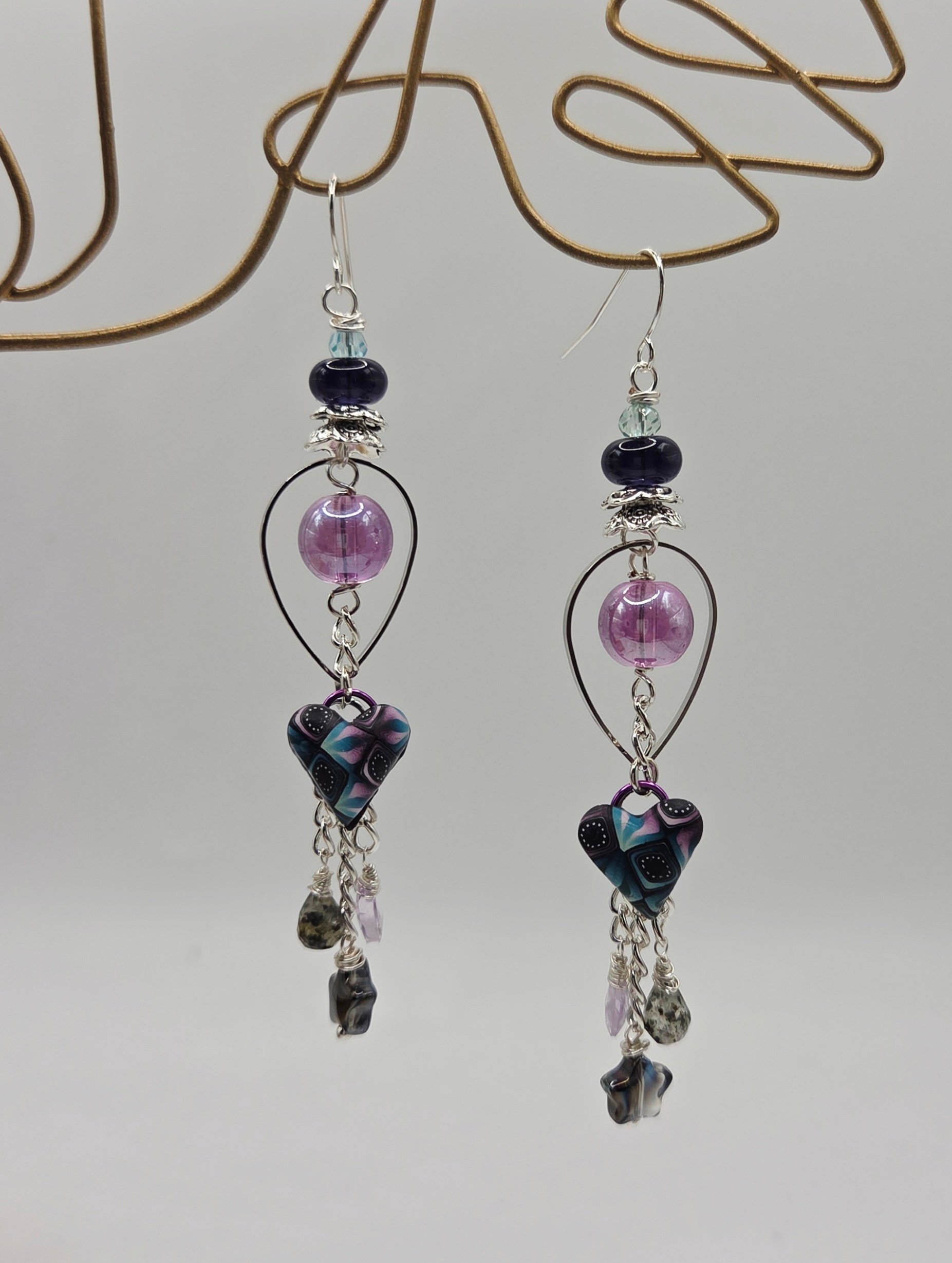 A fantastic pair of earring with all handmade components. Polymer hearts hang from either nobium teardrops or circles and are accented with glass beads, gemstones and glass stars. 3" Hypoallergenic earwires