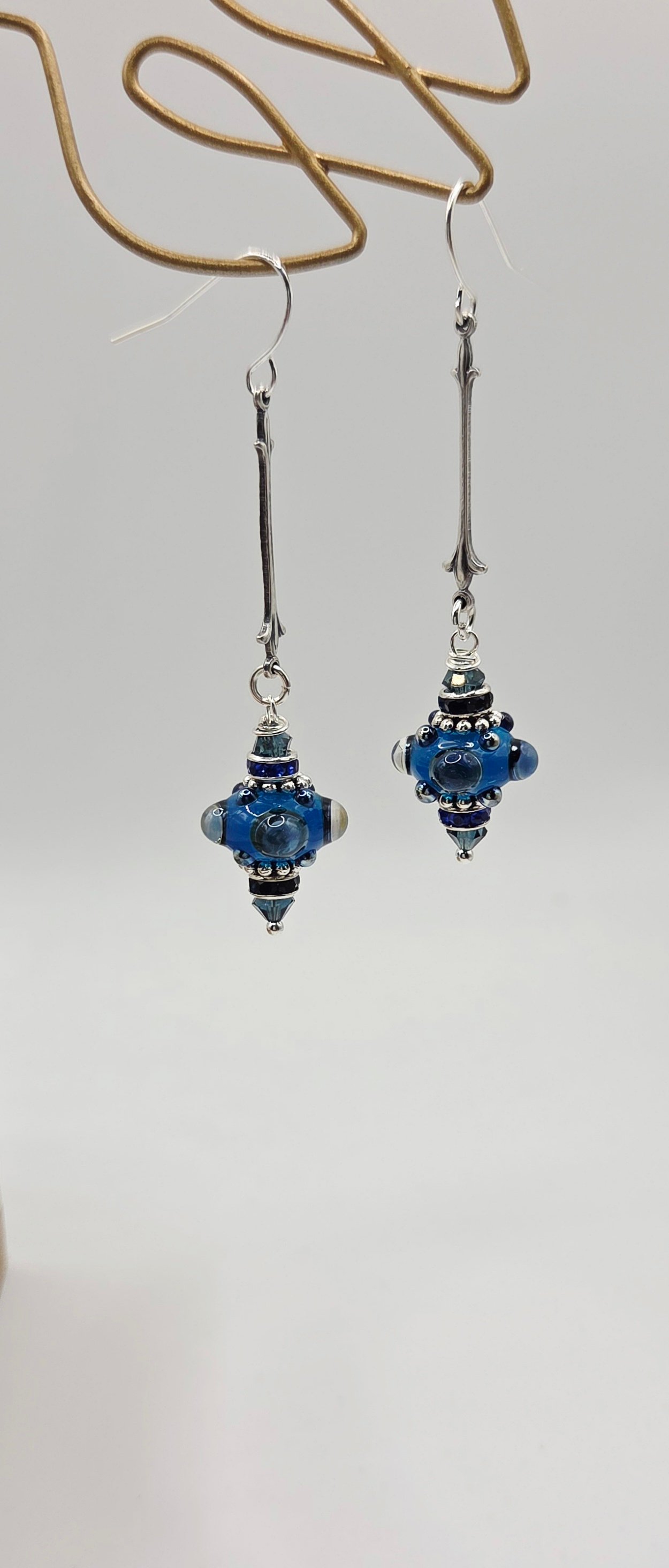 These earrings feature a sleek simple design. Vintage silver fleur d' lis connectors lead down to stunning handcrafted jeweled looking glass beads, rhinstone spacers and crystal accents. 3" Earhooks are sterling plated hypoallergenic.